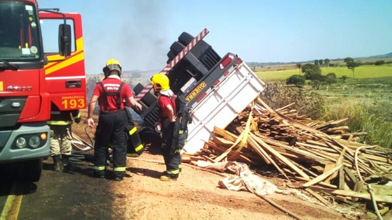 O condutor de uma carreta carregada de madeira, acabou perdendo o controle do veículo que saiu fora da pista e tombou, vindo a pegar fogo.
