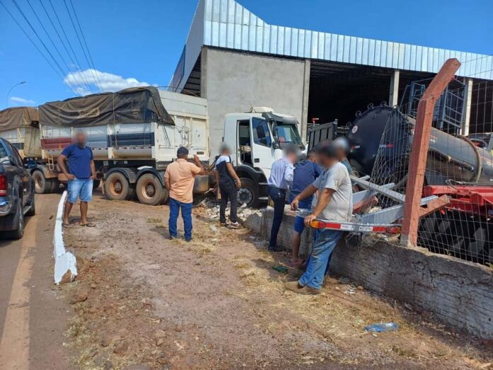 Uma carreta Volvo, bitrem, acabou se movimentando sozinha, quebrando um muro e adentrando no pátio de uma empresa comercial em Colíder, na tarde desta sexta-feira.