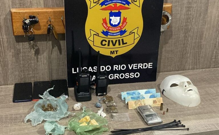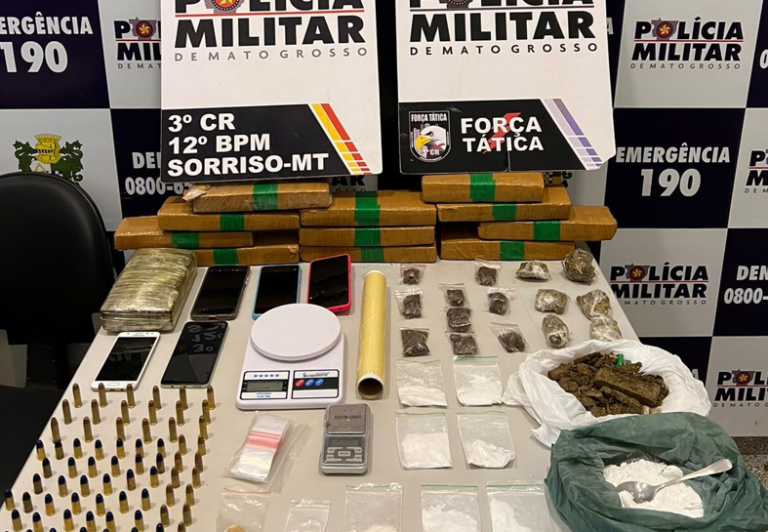 Policiais militares da Força Tática de Sorriso prenderam dois homens e duas mulheres e apreenderam uma adolescente por formação de quadrilha, tráfico de drogas e