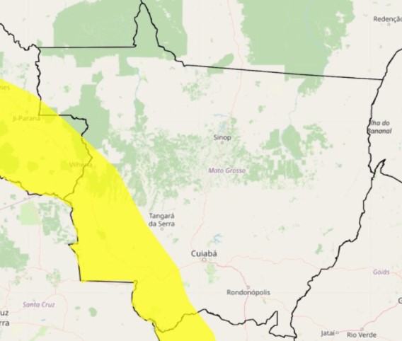 Como uma esperança, o Instituto Nacional de Meteorologia emitiu um alerta de perigo potencial de tempestade para a região Oeste de Mato Grosso, na manhã