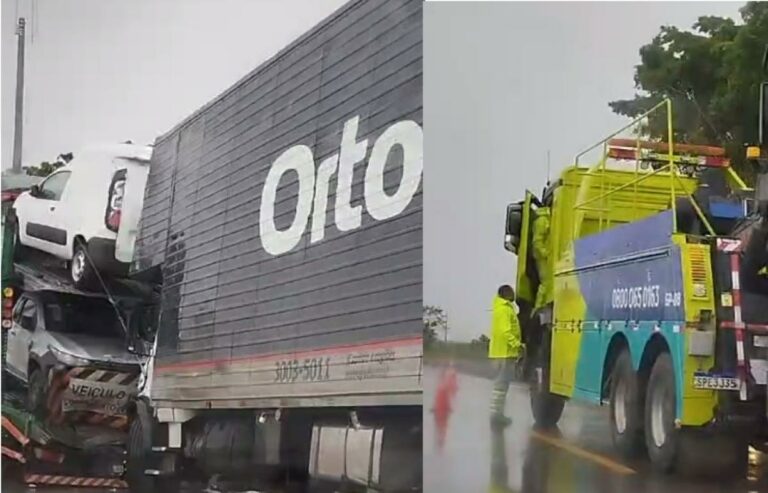 Um homem, que não teve seu nome divulgado, ficou ferido em um acidente envolvendo duas carretas e um caminhão cegonha nas primeiras horas da manhã