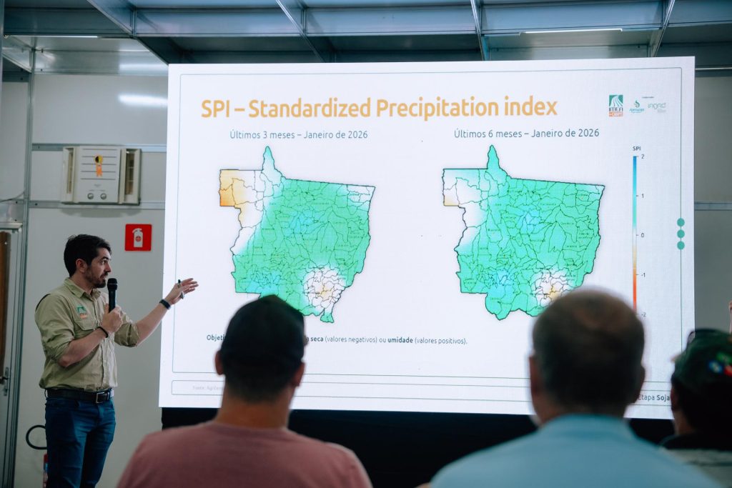 Para o milho, a projeção atual indica área plantada de 7,39 milhões de hectares, produtividade média estimada em 116,6 sacas por hectare e produção prevista de 51,72 milhões de toneladas. Segundo Henrique, o resultado final ainda depende diretamente do comportamento climático nas próximas semanas, especialmente das chuvas previstas para o fim de abril e início de maio.
