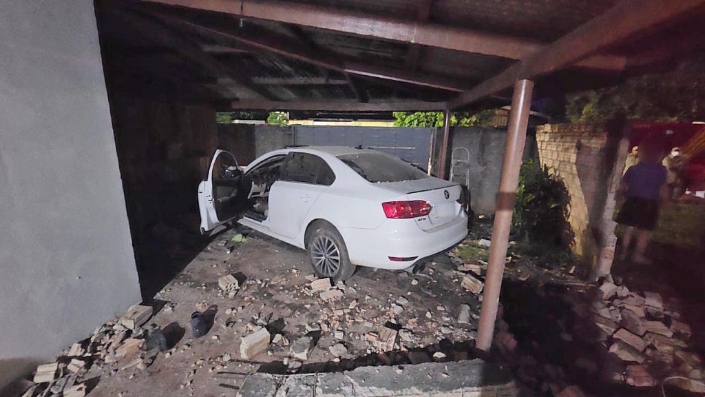 Um motorista perdeu o controle de um Volkswagen Jetta e invadiu o quintal de uma casa ao derrubar o muro do imóvel com o veículo na madrugada desta sexta-feira (15) em Alta Floresta.