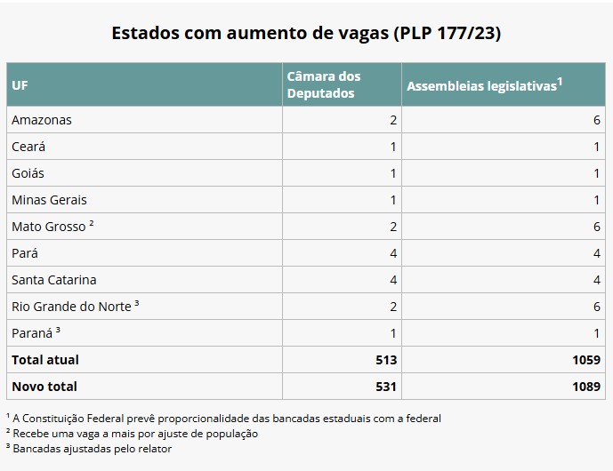 Assim, o Pará passará a ter mais 4 deputados (bancada de 21), da mesma forma que Santa Catarina (de 16 para 20 deputados), Amazonas aumenta sua bancada de 8 para 10, Ceará passa de 22 para 23 deputados, Goiás aumenta de 17 para 18 e Minas Gerais de 53 para 54.