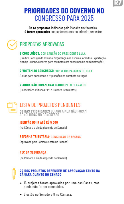 O levantamento foi feito pelo R7 com base na relação de prioridades do Planalto e aprovações do Congresso. A lista do governo foi formalmente apresentada aos presidentes da Câmara, Hugo Motta (Republicanos-PB), e do Senado, Davi Alcolumbre (União-AP) em fevereiro.