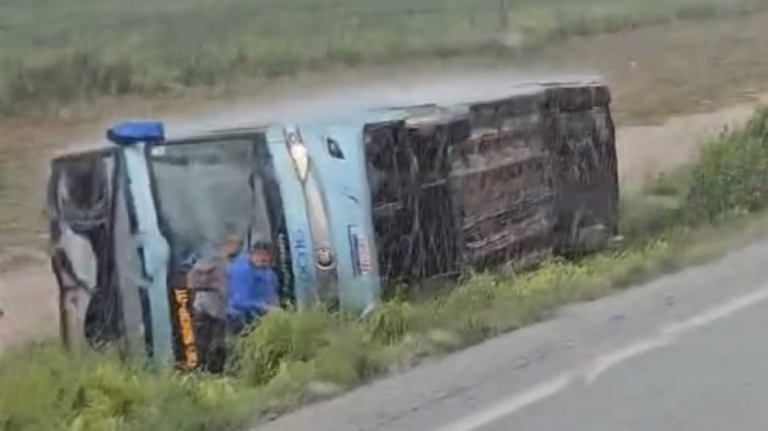 Onze pessoas ficaram feridas após um ônibus de viagem tombar no km 673 da BR-163, no município de Lucas do Rio Verde (332 km de