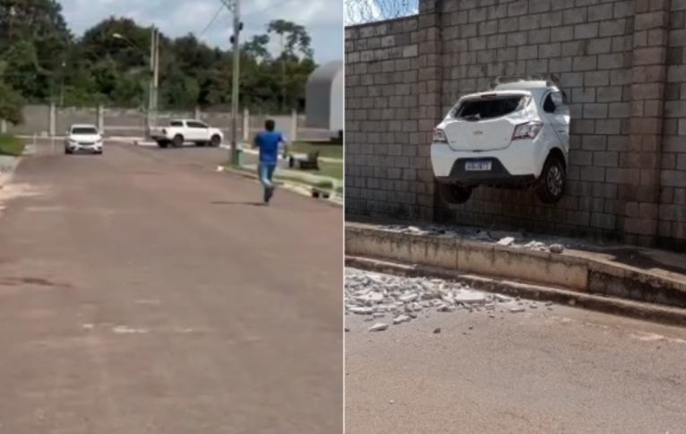 Um vídeo que circula na internet mostra o motorista de um Chevrolet Onix tentando salvar seu veículo que descia desgovernado ladeira abaixo em um condomínio