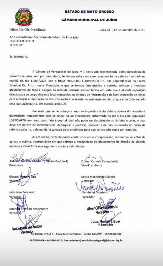 No texto do ofício enviado pelos vereadores ao secretário Alan Porto, o grupo diz que “[a palestra] extrapolou os direitos de informação e da livre circulação de ideias para alcançar a realização de ativismo sectário e sexista no ambiente escolar, que é no todo vedado pela legislação pátria, em especial pela LDB”, escreveram, se referindo às Leis de Diretrizes e Bases da Educação Nacional.