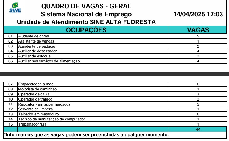 Na unidade de Alta Floresta, são registradas 44 oportunidades de trabalho nas ocupações de empacotador à mão (6), trabalhador em matadouro (6), ajudante de obras (5), repositor em supermercados (5), auxiliar de desossador (4), auxiliar nos serviços de alimentação (4), operador de caixa (3), atendente de pedágio (2), auxiliar estoque (2), operador de tráfego (2), assistente de vendas (1), motorista de caminhão (1), servente de limpeza (1), técnico de manutenção de computador (1) e trabalhador rural (1).
