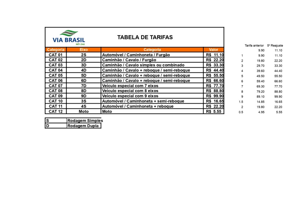 A partir da meia noite (00h00), da quarta-feira (13), entra em vigor o reajuste contratual anual da tarifa de pedágio do trecho sob concessão das rodovias estaduais MT-320 e MT-208.