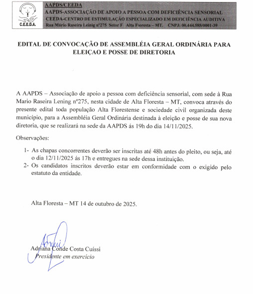 A Associação de Apoio à Pessoa com Deficiência Sensorial (AAPDS), de Alta Floresta, realizará no dia 14 de novembro, às 19h, a Assembleia Geral Ordinária para eleição e posse da nova diretoria.