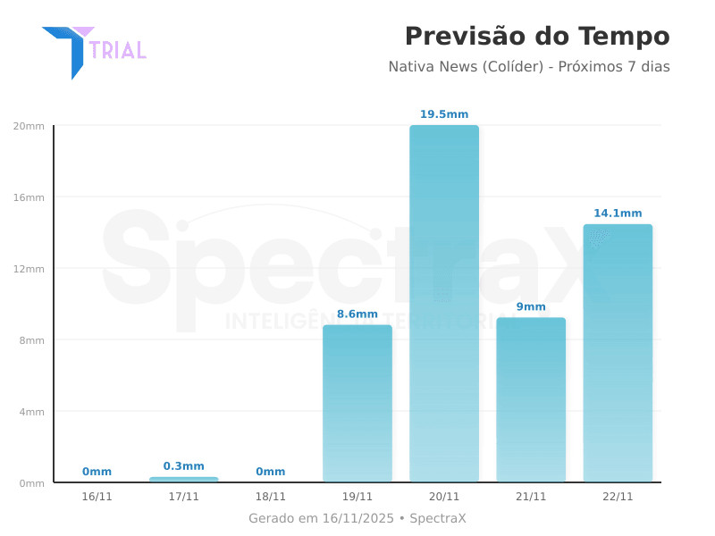 O gráfico disponibilizado pela SpectraX indica aumento gradual no volume de chuva até atingir o ponto mais crítico da semana na quarta-feira (19), com 19,2 mm de precipitação o maior acumulado entre 16 e 22 de novembro.