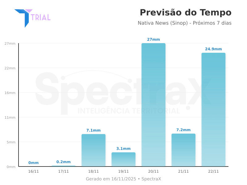 Os dados utilizados nesta previsão são fruto do SpectraX Business, que emprega sensores ambientais, modelagem atmosférica e inteligência artificial para gerar projeções de curto prazo com maior precisão. A parceria experimental permite ao Nativa News uma leitura mais técnica e detalhada do comportamento climático em cidades do norte de Mato Grosso.