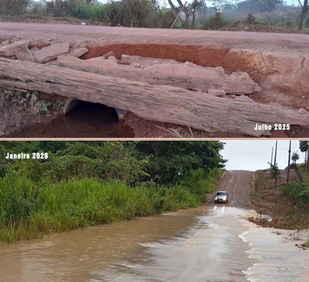 O problema, segundo a comunidade, não é recorrente por manutenção, mas consequência direta da falta de uma obra definitiva. Em julho do ano passado, os moradores já haviam denunciado que o bueiro apresentava rompimento, cobertura com madeiras podres e tubos de plástico parcialmente obstruídos por terra, o que comprometia completamente a vazão da água.