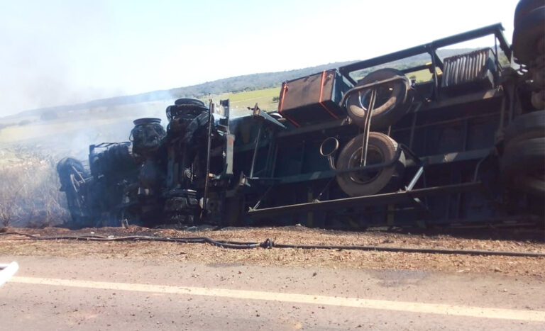 O condutor de uma carreta carregada de madeira, acabou perdendo o controle do veículo que saiu fora da pista e tombou, vindo a pegar fogo.