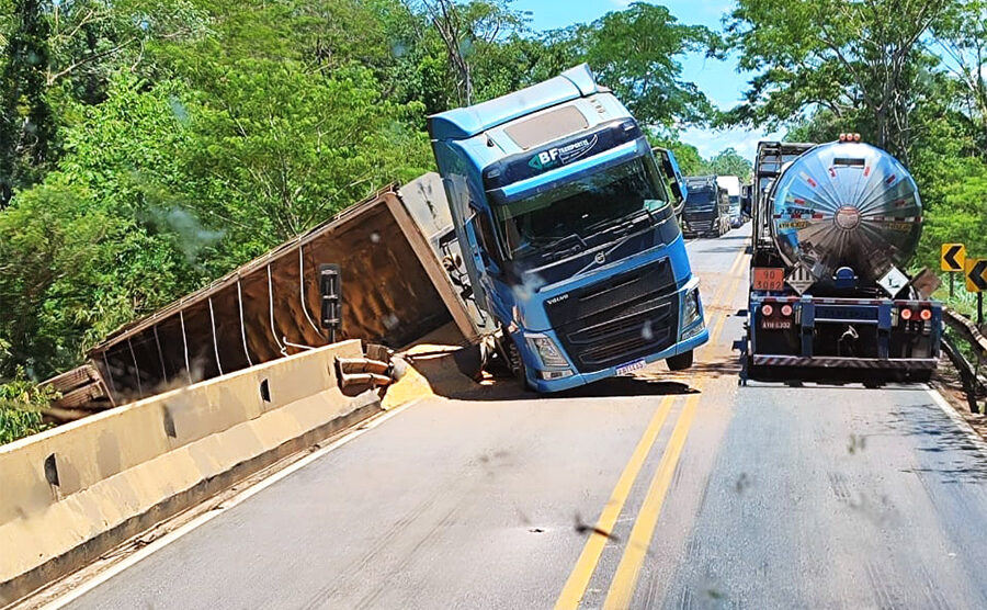 Conforme a assessoria da concessionária Nova Rota do Oeste, a carreta tombou sobre a defensa metálica de proteção que fica sob o rio preto. Com isso, o último vagão acabou saindo da pista, ficando pendurado.
