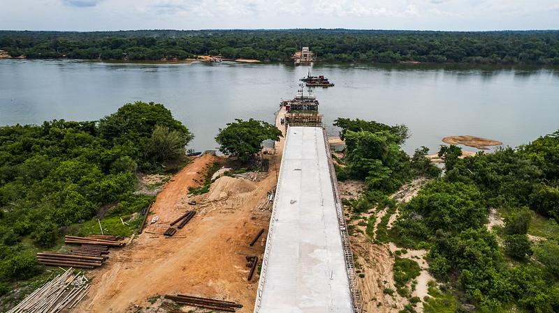 A ponte sobre o Rio Teles Pires, na MT-325, em Alta Floresta, já está com aproximadamente 90% da sua estrutura executada. A obra teve início em março de 2021 e deve ficar pronta no primeiro semestre de 2024. O investimento é de R$ 42,5 milhões.
