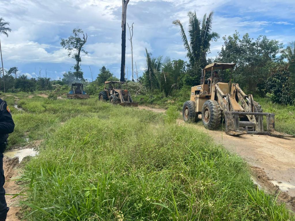 Durante averiguação na área informada, o grupo encontrou dois tratores, uma concha, duas pás-carregadeiras e dois guinchos, um deles sendo operado por um homem identificado em flagrante. Além das máquinas, foram localizadas 26 toras de árvores abatidas de várias espécies.