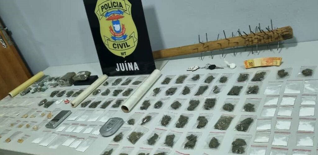 Na casa foram apreendidas diversas porções de entorpecentes e documentos de uma mulher investigada, que saiu de Juara para assumir as funções de disciplina da facção criminosa em Juína.
