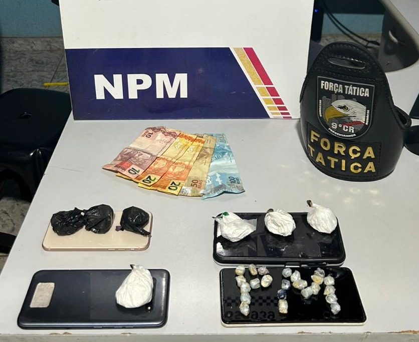 Durante as buscas na residência, os policiais encontraram outro homem e duas mulheres fazendo uso de maconha. Em revista ao imóvel, foram localizadas diversas porções médias e pequenas de pasta base de cocaína, confirmando o tráfico no local.