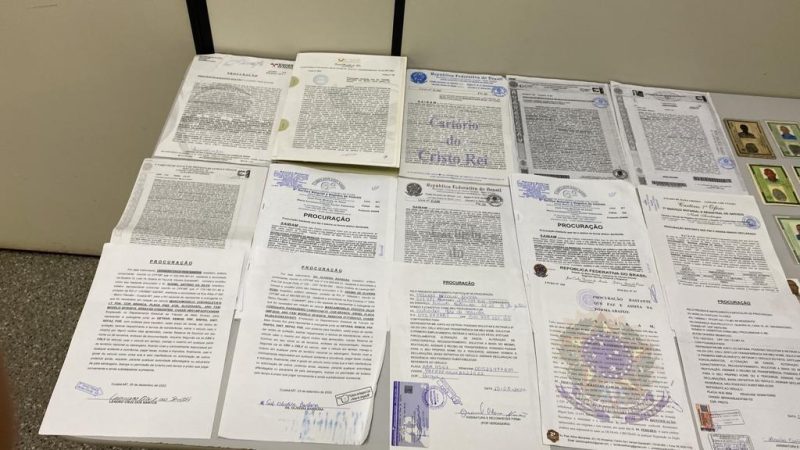 Com base no levantamento, foi representado pelo mandado de busca e apreensão na residência do suspeito, ocasião em que foram apreendidos vários documentos falsos, entre eles, identidades falsas, em nomes diversos, porém com fotografias da mesma pessoa, procurações e selos de cartórios falsos ou adulterados, dentre outros documentos.No dia das buscas, o investigado não foi localizado, sendo a convivente do investigado presa em flagrante. Após análise do material apreendido e elementos informativos angariados durante as investigações, o delegado Marcelo Menezes, representou pelo mandado de prisão preventiva do investigado, que foi deferido pela Justiça e cumprido na quinta-feira (14),