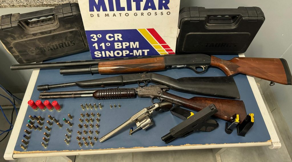 Policiais militares do 11º Batalhão apreenderam, na noite deste domingo (24.11), cinco armas de fogo, 62 munições, três carregadores e prenderam um homem, de 41 anos, por porte ilegal e violência doméstica, no bairro Camping Clube, em Sinop. A esposa do suspeito, de 38 anos, relatou que foi agredida pelo homem e que também pegou uma das armas para se defender do agressor.