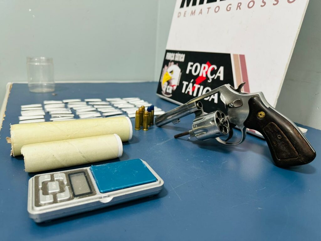 Equipes da 26ª Companhia Independente de Força Tática apreenderam, na madrugada desta quinta-feira (25.07), 47 porções de substância análoga à cocaína, um revólver .38 e seis munições do mesmo calibre. Os militares ainda prenderam um homem 26 anos suspeito por associação criminosa, tráfico e porte ilegal de arma de fogo em Sinop (480 km de Cuiabá).