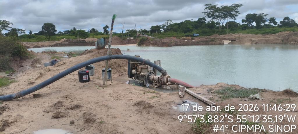 Ao chegarem na região, os militares flagraram um garimpo ilegal em pleno funcionamento, onde dois motores estacionários estavam acoplados em uma bomba de sucção. Além disso, os policiais também encontraram uma escavadeira, uma calha concentradora de minérios e dois contêineres de combustível.
