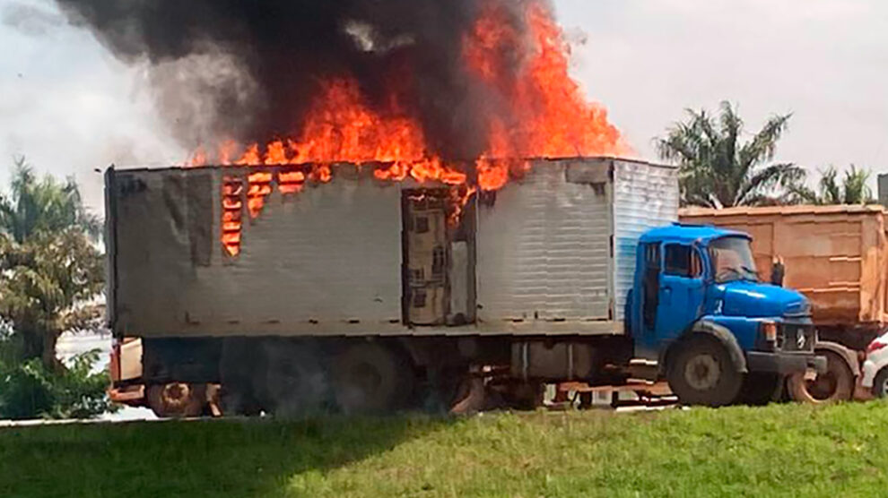 Um caminhão Mercedes-Benz 1113 teve parte do baú destruído pelas chamas, há pouco, no perímetro urbano da rodovia federal, em Lucas do Rio Verde. O motorista saiu ileso, segundo informações do Corpo de Bombeiros. A causa do incêndio é investigada.