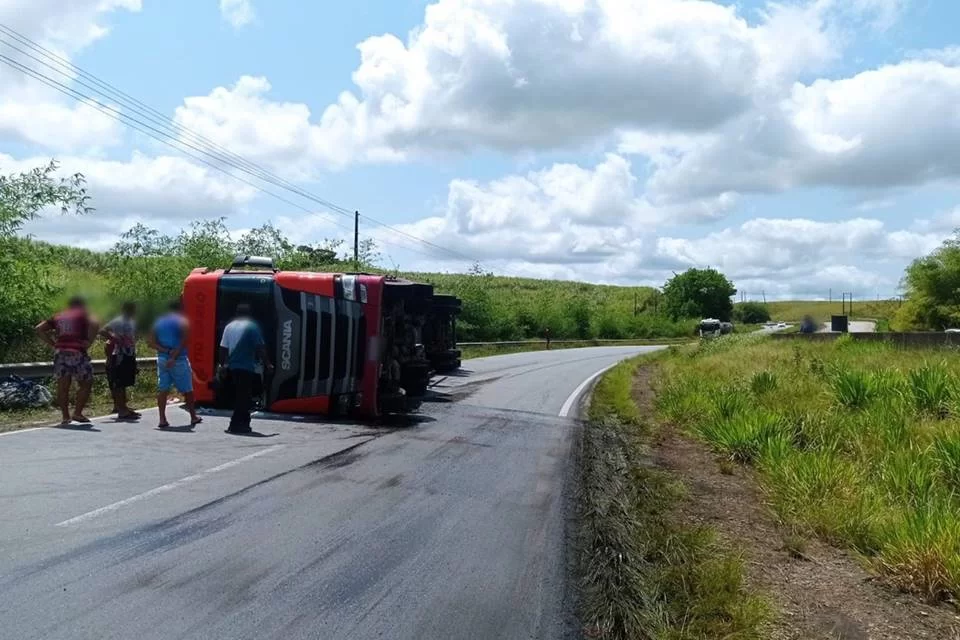 Um caminhão tombou na rodovia BR-101, entre os municípios de Colônia Leopoldina e Jundiá, na Zona da Mata de Alagoas, na tarde desta sexta-feira (15). O motorista teve apenas ferimentos leves. O veículo levava carga de bolacha, que foi saqueada.